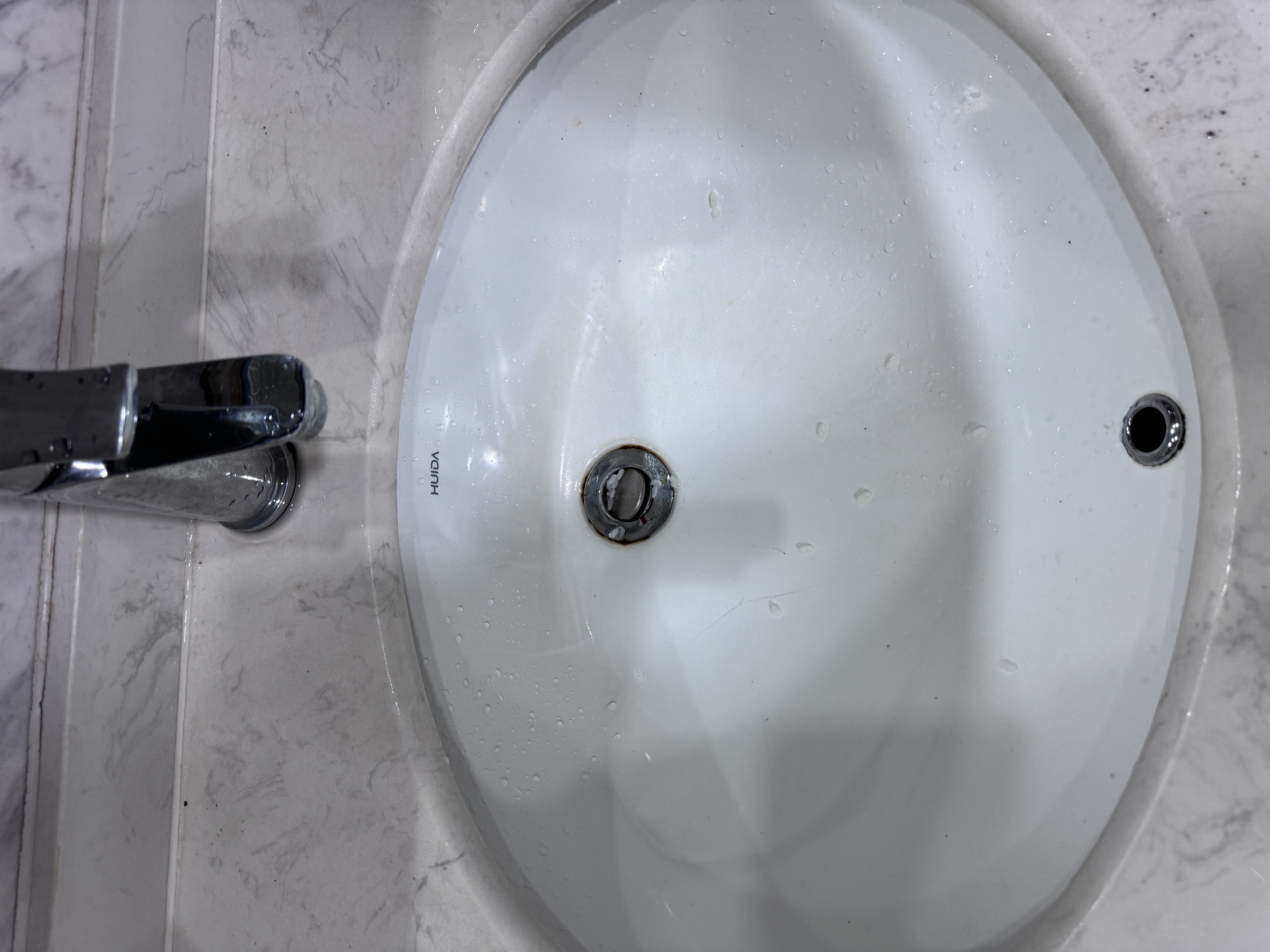五层洗手池下水不畅,盆里有饭菜、饭粒。