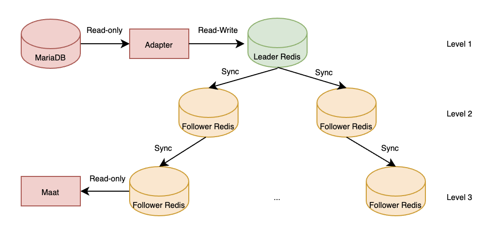 # Configuration management Input must use UTF-8 without BOM encoding, for example, MySQL use utf8mb4. It supports dynamic loading and multi-machine synchronization of configurations. Maat supports three configuration loading modes: - [Redis mode](#1-redis-mode) - [Json mode](#2-json-mode) - [Iris mode](#3-iris-mode) ## 1. Redis mode As shown in the diagram below, the data source is stored in the relational database `MariaDB`. An adapter writes this data into the `leader redis`, which is then distributed through redis's `leader-follower synchronization` mechanism. The storage structure design in redis for configurations does not need to consider the logical relationships between rule, object, and item. Maat will construct these logical relationships internally after loading the configurations from redis. ### 1.1 Transactional Write | Redis KEY | Name | Structure | Purpose | | ------------------ | ---------------- | ----------- | ---------------- | | MAAT_VERSION | primary version | INTEGER | Identifies the version number of configurations in redis. When the version number in redis is greater than the version number configured in MAAT, it reads MAAT_UPDATE_STATUS. | | MAAT_PRE_VERSION | pre-version | INTEGER | | | MAAT_TRANSACTION_xx| Transaction configuration status | LIST | Temporarily stores the configuration status in the transaction. xx is one of the states in MAAT_PRE_VERSION, which will be updated to MAAT_UPDATE_STATUS after the transaction ends and will be deleted itself. | | MAAT_UPDATE_STATUS | Configuration status | sorted set, where the member is a configuration rule and the score is the version number | MAAT reads this using ZRANGEBYSCORE command. | | MAAT_RULE_TIMER | Main configuration timeout information | Sorted Set, where the member is a configuration rule and the score is the timeout | MAAT configuration update thread periodically checks timeout status and sets timeout state. | | MAAT_VERSION_TIMER | Version creation time | Sorted Set | Stores the creation time of each version, where the score is the version creation time and the member is the version, used to keep MAAT_UPDATE_STATUS within a smaller scale. | | MAAT_LABEL_INDEX | Label index | Sorted Set, where the element is the configuration table name, rule_id, and the score is the label_id | | | EFFECTIVE_RULE:TableName,ID OBSOLETE_RULE:TableName,ID | Main configuration | string | Active configurations, loaded one by one by MAAT. | | SEQUENCE_REGION | Region ID generation sequence | INTEGER | Used by producers to generate unique region_id(item_id) | | SEQUENCE_OBJECT | Object ID generation sequence | INTEGER | Used by producers to generate unique object_id | | EXPIRE_OP_LOCK | Distributed lock | string "locked" | Ensures that at most one writer performs eviction. | `Note`: The following api supports writing one line of configuration to redis. ```c int maat_cmd_set_line(struct maat *maat_instance, const struct maat_cmd_line *line_rule); ``` ### 1.2 Primary_version、Pre_version and Lua Script When a producer wants to modify the configuration, it first increments the `preliminary version` and use it as the version for writing the configuration status. Once the configuration change is completed, it then increments the `primary version`. This method can greatly improve the writing performance and ensure successful writing except for ID conflicts. When there are multiple producers, there may be a nconsistency between the configuration status version and the primary version. Let the primary version be v and the version declared in the configuration status during a particular update be u. Incremental updates by consumers can lead to the following scenarios: - If v == u, the version numbers are consistent, and the configuration is loaded normally. - The situation where v > u only occurs when there are three or more producers. This may lead to configuration loss, as illustrated in the table below. - If v < u, it indicates that among the two producers, the one that started writing first has not yet completed. In this case, only update to version v for this time, and update to u will be carried out in the next polling. |time | producer1 |producer2|producer3|consumer| |-----|--------------------------------|---------|---------|-------| |0 |ready to update mv=3924, tv=3925| | | | |1 | |ready to update mv=3924, tv=3925| | | |2 | | |ready to update mv=3924, tv=3927| | |3 | | |ready to update mv=3925, tv=3927|get version 3925, zrangebyscore can't get status of version 3925| |4 | |ready to update mv=3926, tv=3926| |maat version increased to 3926 with error noncontigous| |5 |update completed | | |3925 is skipped| When consumers perform a full update, they do not need to read the version of the configuration status; instead, they directly read all valid configurations. This is because the configuration write and the increment of the primary version number by 1 are executed within the same transaction. Therefore, the full configuration version read will always be consistent with the primary version. At the end of the transaction, a Lua script is used to check the transaction version (transaction_version) against the primary version number (maat_version): - If tv equals mv, no correction is needed. - If tv is greater than mv, the incremental update for this transaction will be applied in the next iteration. - If tv is less than mv, how to identify the rules for the configuration status written in this transaction and then can change the score to mv? To address the issue of transaction version being less than maat_version at the end of the transaction, the Redis list MAAT_TRANSACTION_xx is used to store configuration update status, where xx is derived from MAAT_PRE_VERSION. At the end of the transaction, a Lua script is used to synchronize MAAT_UPDATE_STATUS and delete MAAT_TRANSACTION_xx. ### 1.3 MAAT_UPDATE_STATUS In this structure, a Sorted Set is used to store the change status of the main configuration, where the score represents the