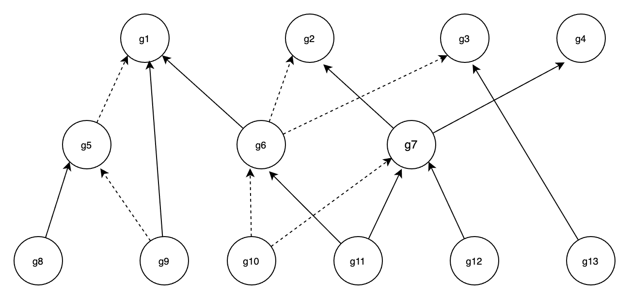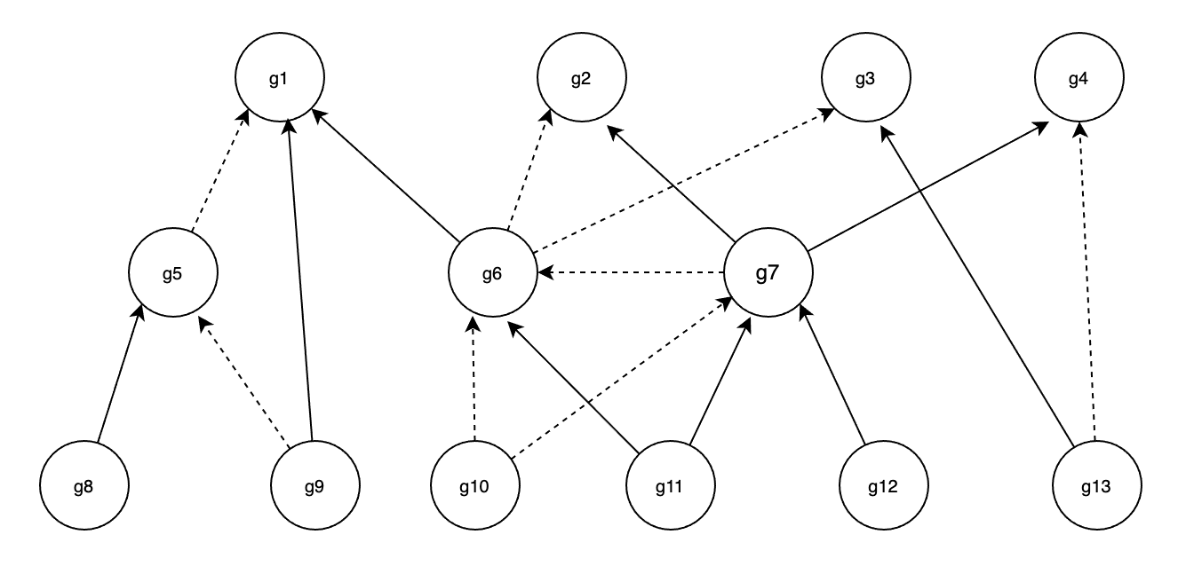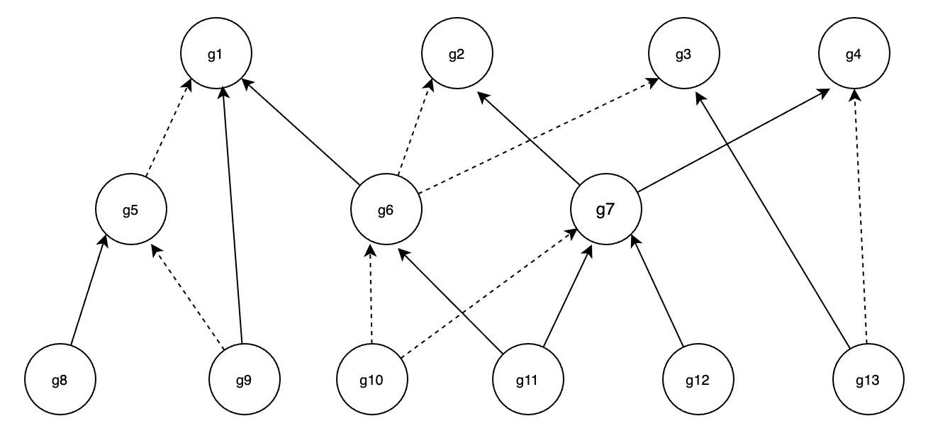 Now, let's see a graph of hierarchy example, where the dotted line means exclude. If the matched subordinate objects: **{g11, g13}**, then activated superiors: **{g2, g7}**.