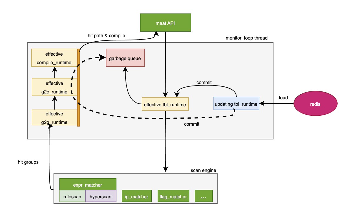As mentioned earlier, maat supports three configuration loading mode, using redis as an example here. The maat monitor_loop thread periodically checks for updates in the redis. Updating the configuration of a specific table generates the corresponding updating runtime. When updating is complete, a commit operation is triggered, transforming the updating runtime into a new effective runtime, while the original effective runtime is put into the garbage collection queue.